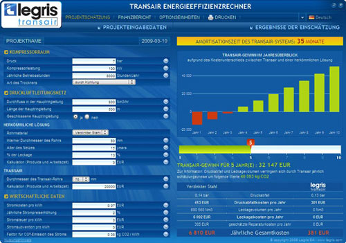 Die Transair Energy Efficiency Calculator Software berechnet die Einsparungen und die Amortisationszeit anhand der Kompressorendaten, wie Kompressorleistung, Ausgangsdruck des Kompressors, die jährlichen Betriebsstunden, die Art des Trockners sowie die Daten der Netzwerkleitung, die Länge der Hauptringleitung, offene oder geschlossene Ringleitung, das verwendete Rohrmaterial sowie die Kosten für Strom, inkl. der voraussichtlichen jährlichen Strompreiserhöhung.