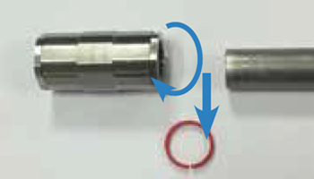 Stecken Sie den roten Demontagering auf das Rohr und schrauben Sie die Mutter wieder auf den Verbinder.