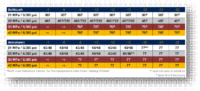 Entwickelt für die gängigsten Betriebsdrücke in der Hydraulikindustrie hebt sich GlobalCore deutlich vom Wettbewerb ab und bietet unseren Kunden weltweit eine einfache Schlauchfamilie mit konstantem Betriebsdruck.