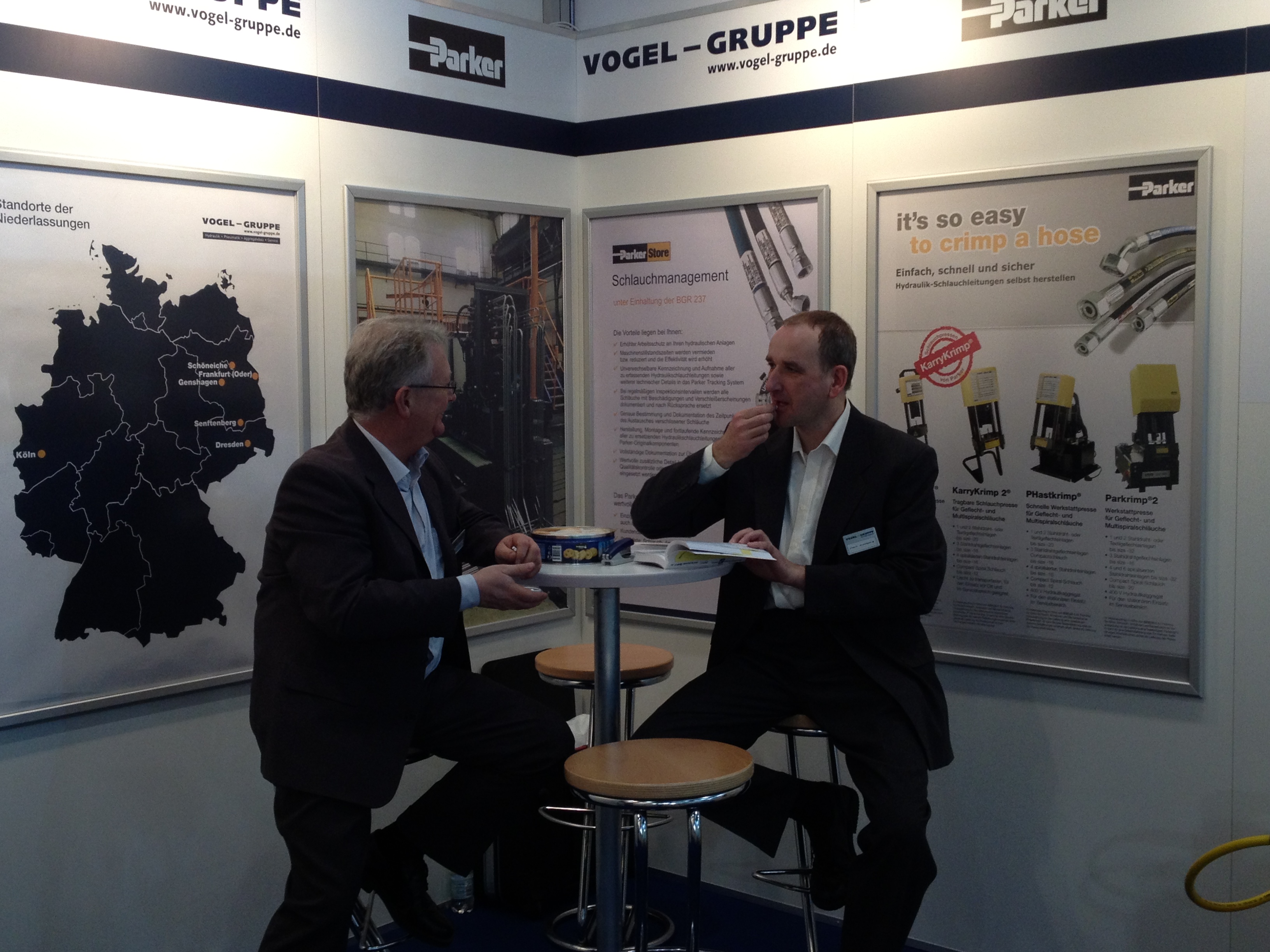 Unsere Kollegen konnten viele interessante Gespräche führen und zahlreiche interessierte Besucher haben sich über das Produkt- und Leistungsportfolio im Hydraulik und-Pneumatik-Service-Bereich sowie den Spezialgebieten Aggregatebau und Rohrbiegeservice informiert. Regelmäßig bildeten sich Trauben um die Parker Schlauchpresse "KarryKrimp", mit der viele Vertreter aus Instandsetzungsbereichen sich selbst beim Anfertigen eines Hydraulik-Schlauches versuchen konnten.